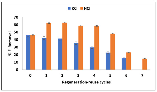 Figure 12 shows the change in percentage fluoride removal with continuous regeneration-reuse cycles. The percentage of fluoride removal decreases with continuous reuse of the adsorbent when KCl was used as the regenerant. Quantitatively, the percentage fluoride removal decreased from 42.4% to 15.2%. The decrease could either be due to the gradual dissolution of MNS during treatment of used adsorbent by KCl or due to inadequate reactivation of the adsorbent’s active sites.