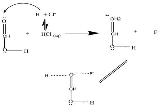 The fluoride adsorption at pH below pHpzc negative fluoride ions may be attracted to the positive surface of the adsorbent via electrostatic attraction forces (Equation (7)). At near neutral pH where the optimum uptake occurred, fluoride adsorption could be due to ion exchange and because of weak van der Waal forces (Equation (8)). Conversely, at pH above pHpzc where the surface is negatively charged and OH− dominates the surface, there could be electrostatic repulsion forces formed between negatively charged surface and negative fluoride ion leading to lower fluoride adsorption. However, fluoride could also be adsorbed as a results of ion exchange between the OH− and F− (Equations (9) and (10)).