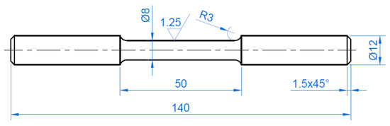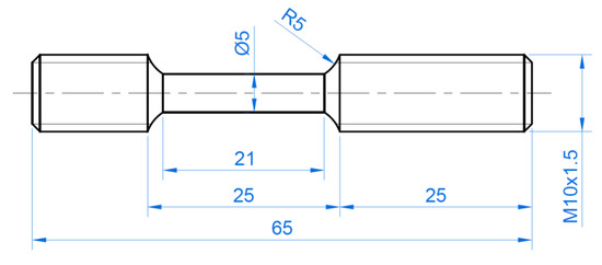 The basic mechanical properties of the materials tested have been determined using the uniaxial tensile test according to the EN ISO 6892-1:2016-09 standard [23]. Measurements were carried out at room temperature at a strain rate of 0.0027 s−1 on an MTS 810 uniaxial servo-hydraulic machine. Three specimens (Figure 4) were tested for each material and the average Basic Mechanical parameters were determined.