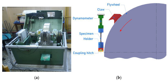 An instrumented rotary hammer (Figure 5a) was used for dynamic stretching of the samples (Figure 5b). The measuring equipment of the rotary hammer consisted of a strain gauge dynamometer, a system amplifier, and a computer system for measuring the dynamic parameters. Before the measurements, the indications of the rotational speed of the drum on which the hammer claw was placed were calibrated with the strain gauge dynamometer. Samples for dynamic tests (Figure 6) were prepared on the basis of samples subjected to HE. The tests were carried out for three impact velocities: 15, 25 and 35 m·s−1, which corresponds to the following strain rates: 750, 1250 and 1750 s−1. Three specimens were tested for each material.