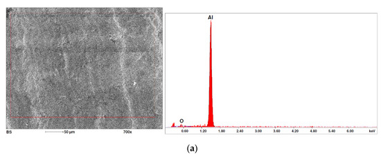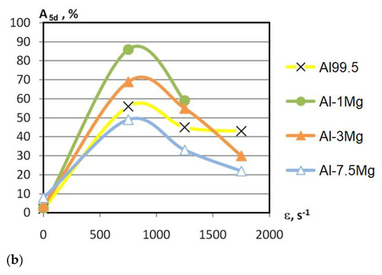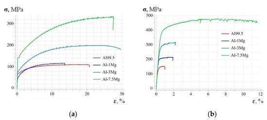 Figure 7a shows the stress–elongation curves obtained for the Al99.5 aluminium and aluminium alloys tested. The basic mechanical parameters for Al99.5 aluminium were as follows: ultimate tensile stress (UTS) Rm = 105 MPa, yield stress (YS) Rp0.2 = 65 MPa and relative elongation ε = 21%. The addition of only 1% Mg (Al-1Mg) caused the appearance of the Portevin–Le Chatelier (PLC) effect, which describes a serrated stress–strain curve above the yield point. A change in mechanical properties of the Al-1Mg alloy in relation to Al99.5 aluminium led to following parameters: Rm = 118 MPa (12% increase), Rp0.2 = 43 MPa (34% decrease) and relative elongation ε = 14% (34% decrease). The occurrence of slight strain hardening and an increase in Rm-value by 15 MPa caused a reduction in the yield stress by 22 MPa and thus an increase in the plasticity margin by 77% with a clear reduction in plasticity to 13.8%. Increasing the Mg content to 3% in Al-3Mg alloy caused a further increase (in relation to Al99.5 aluminium) in all the parameters describing mechanical properties: Rm increased by 90% (to 200 MPa), Rp0.2 increased by 6.2% (to 73 MPa) and the relative elongation ε increased by 40% (to 29.5%). The PLC effect persisted but with an increased amplitude. This amplitude reduced its range to 7.5% for an alloy with increased Mg content (Al-7.5Mg). The differences in the mechanical properties of Al-7.5Mg alloy in relation to Al99.5 aluminium were as follows: Rm increased by 216% (to 332 MPa), Rp0.2 increased by 115% (to 140 MPa) and relative elongation ε increased by 33% (to 27.9%). The changes in the mechanical properties of the Al-7.5Mg alloy in relation to the Al-3Mg alloy (Mg content increased by 4.5%) were as follows: Rm increased by 66% (to 332 MPa), Rp0.2 increased by 92% (to 140 MPa) and the relative elongation ε decreased by 7% (to 27.9%). The increase in strength of the aluminium alloy with increasing Mg content is confirmed by data found in the literature [16,24].