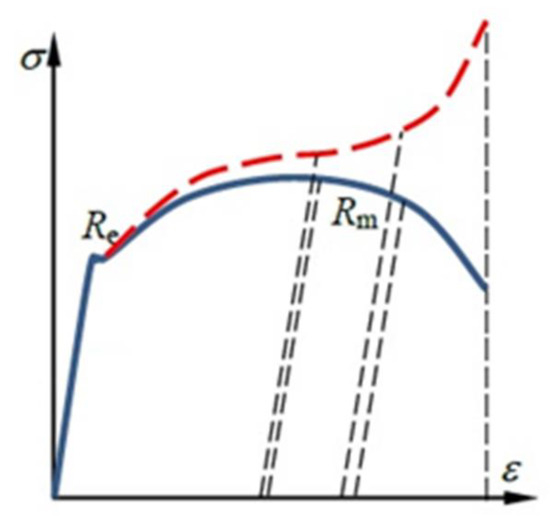 Nominal (blue line) and true stress–strain (red line) characteristic of material: Re—yield stress, Rm—ultimate tensile stress [26].