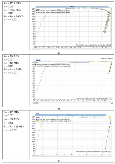 Carrying out engineering calculations concerning the elastic–plastic range of the test material requires the preparation of the parameter σtrue = f(εtrue). The nominal characteristics σnom = f(εnom) resulting from the assumption of the initial cross-section A0 = const. for the entire characteristic makes it impossible to use it in numerical analyses of material forming processes. It was obvious that the cross-section of the specimen was reduced during the uniaxial tensile test. In the elastic range, the changes in the cross-section that occurred were not taken into account due to slight changes. They gained significance when the yield point was exceeded, where the speed of change in the cross-sectional area of the specimen increased. The true stresses are defined by the ratio of tensile force F and the cross-sectional area of the sample depending on this force at a given moment. At the moment of fracture, the measurement of the cross-section is troublesome to perform and only modern techniques (e.g., Digital Image Correlation—DIC) are able to measure the true reduction in the area at fracture. Figure 9 shows selected tensile curves of the aluminium and Al-Mg alloys tested, which were produced using Aramis, a non-contact and material-independent measuring system based on DIC.