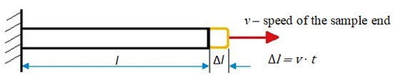In Equation (11), v defines the speed at which a sample with length l (Figure 11) is stretched in time t, so the strain rate can be represented as follows:
