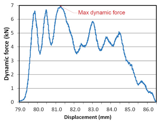 The dynamic tests of samples taken from bars subjected to HE (u = 0.86) were carried out at a minimum of three speeds of the rotary hammer of 15, 25 and 35 m·s−1, which corresponds to the following strain rates 750, 1250, 1750 s−1. During the dynamic tests, the course of dynamic force versus displacement was recorded. Figure 12 shows an example of the diagram of the dynamic tensile force recorded on the oscilloscope of a rotary hammer and the method of reading the maximum dynamic force adopted for the calculation of dynamic tensile stress Rmd.