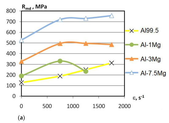 - For HE-strengthened aluminium alloys, an increase in the strain rate from 750 to 1750 s−1 caused an increase in dynamic UTS Rmd from 1.2 to 1.9 times in relation to static UTS;
