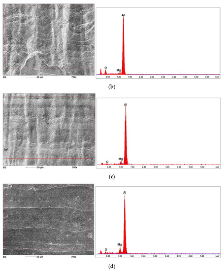 In the case of samples containing magnesium, heterogeneity in the structure of the fracture was observed, which manifested itself in a different size and shape of the voids. The shape of the voids, which depends on the local loading conditions, showed a majority of normal stresses. This type of failure may be due to variations in the chemical composition of the material. Figure 14 summarises the results of the EDS analysis for side surfaces of the bars of the basic sample (Figure 14a) and samples with magnesium content (Figure 14b–d), which confirm the local significant variation in chemical composition.