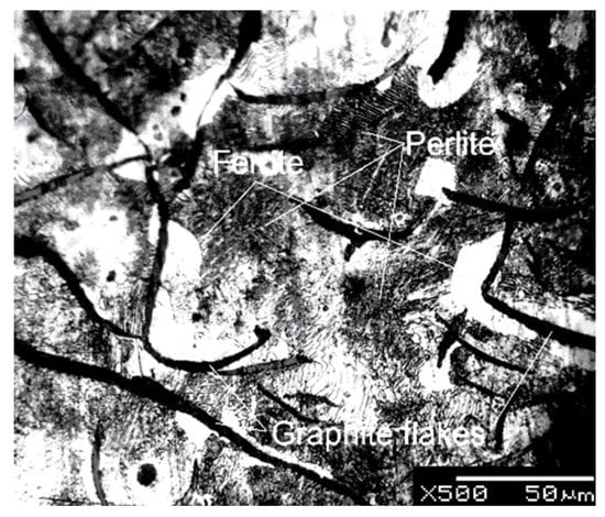 Gray cast iron EN-GJL200 was used as the initial material (Figure 1). This is pearlitic-ferritic cast iron, which was produced at OJSC “MTW” (Minsk, Belarus). According to EN 1561:1997, it contains 3.10–3.40% C, 1.90–2.30% Si, 0.60–0.90% Mn, ≤0.15% P and ≤0.15% S. Its mechanical properties were as follows:Brinell hardness 170–210, tensile strength 200 MPa, compressive strength 800 MPa and shear stress 230 MPa.