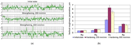 Surface roughness profiles (a) and values of the surface roughness parameters (b) in the initial state and after the laser strengthening with d = 1 mm, v = 200 mm/min and d = 2 mm, v = 600 mm/min.