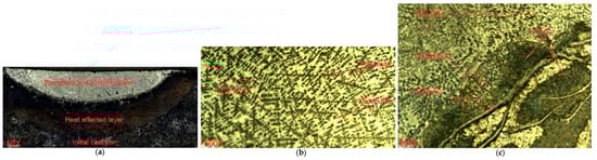 Microstructures of cast iron in the laser beam effect area: (a) general view, (b) remelted and solidified zone and (c) solid-state strengthening zone.