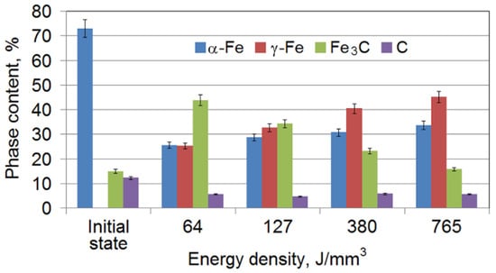 The XRD analysis of cast iron samples revealed characteristic changes in the content of the main structural components after laser treatment (Figure 4). As the surface energy density increased, the austenite γ-Fe content in the cast iron increased, the amount of cementite Fe3C decreased and the graphite content fluctuated between 5.7 and 4.6% (Figure 5). It should be added that austenite was absent in the initial cast iron.
