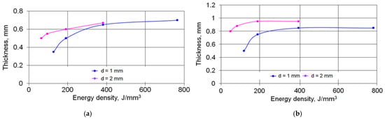 The effect of laser beam energy density: (a) on the thickness of the melted–solidified layer and b) on the thickness of the HAZ.