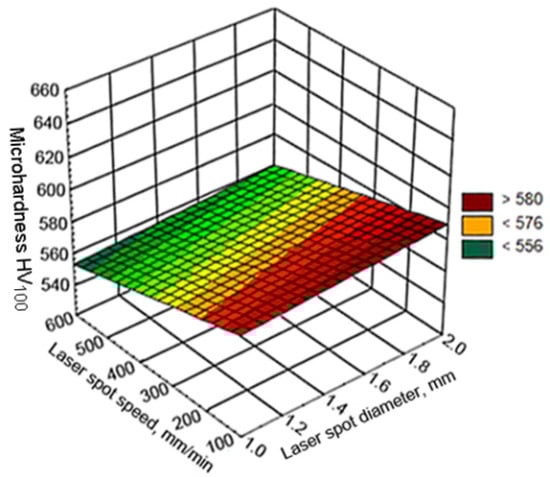 The effects of the laser strengthening parameters on the microhardness of the remelted and solidified layer were insignificant (Figure 8) and can be described by the dependence HV100 = 581.4 + 7.25d − 0.06v.