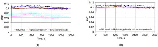Changes over time of momentary COFs after gray cast iron laser strengthening: (a) under a 500 N load and(b) under a 1000 N load.