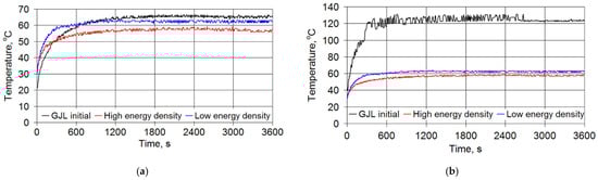 The temperatures in the friction zone depended on the load level. If the loads were negligible, the temperature after the running-in time did not depend on the wear time or the laser strengthening conditions (Figure 10a).