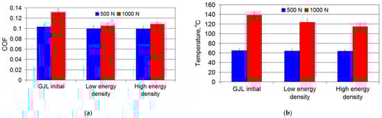 Effect of the laser treatment conditions on (a) the COF and (b) the temperature in the friction zone.