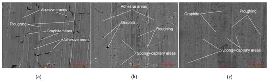 Under laser strengthening and with the action of significant loads and high temperatures, the graphite particles were crushed and changed their shape from flake to pseudo-vermicular (Figure 12b). According to [19], cast iron with a vermicular structure is characterized by a significantly greater wear resistance compared with conventional gray cast iron. It was also found that changes in the surface layer microstructure promote the formation of spongy-capillary areas, which were noticeable on the wear surfaces, especially at a high surface energy density (Figure 12c), and which provided higher wear resistance. A similar effect was described in [20].