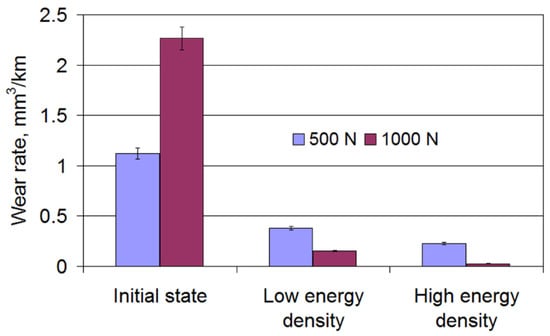 Changes in the wear rate of the surface layer of cast iron after laser strengthening are shown in Figure 13. The registered character of changes was caused by changes in the microhardness and microstructure of the surface layer, depending on the surface energy density of the laser beam. The right choice of strengthening conditions allowed for increasing the wear resistance of the cast iron after strengthening from fivefold to almost tenfold in comparison with the initial cast iron.