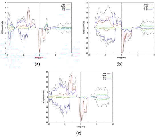 Densities of electronic states: (a) FeCO3; (b) FeAlO3; (c) FeSiO3. The plot is shifted relative to the Fermi energy, shown at zero as a vertical dashed line.