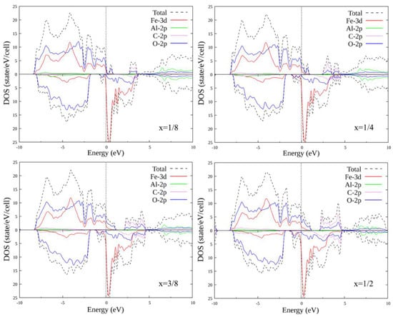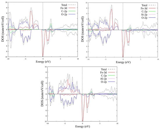 The unit cell of FeCO3 contains two C atoms of the same type (with a symmetrical arrangement); therefore, there is only one nonequivalent option for replacing C with another atom. Al and Si are substituted atoms. One of the C atoms was replaced by Al and Si, respectively. The self-consistent calculations were performed, and the plots of the total and partial densities of states were obtained. A partial substitution of aluminum for carbon (Figure 3) for the minority spin projection decreases the distance between the band below the Fermi level, formed by the O states, and the band at the Fermi level, consisting predominantly of the 3d iron states. For the majority spin projection, a greater mixing of the Fe and O states in the valence band is observed. In this case, the peak above the Fermi level, consisting of the 2p states of carbon and oxygen, decreases. In this case, the states of aluminum do not appear close to the Fermi level, causing a redistribution of density for the other atoms.