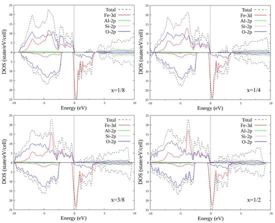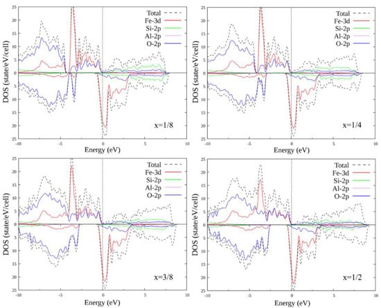 Densities of states FeSi1-xAlxO3, where x = 1/8; 1/4; 3/8; 1/2. Replacement configurations (1, 0), (1, 1), (2, 1), and (2, 2) are selected.