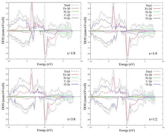 In similarity with the pure compound, self-consistent calculations were performed, and the plots of the total and partial densities of states were plotted for FeSiO3 with all substitution options. Below is only a part of the plots, for configurations (1, 0), (1, 1), (2, 1) and (2, 2) (Figure 6 and Figure 7). The plots within each set with the same number of replaced atoms have insignificant differences; therefore, their consideration is omitted. When Si atoms are replaced by C atoms, the energy gap for the majority spin projection first decreases and eventually disappears completely: the compound transitions from the half-metallic state to the metallic one. A carbon + oxygen + silicon cluster appears, in which the density of the state of carbon increases with an increase in the number of replaced atoms. For the minority spin states below the Fermi level, a small peak appears, including a mixture of the oxygen and iron states. With an increase in the number of the replaced atoms, it first splits into two parts, then merges again and increases in size.