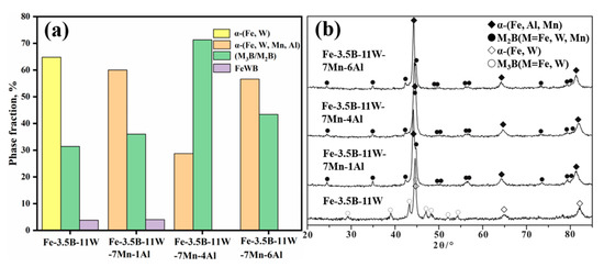 The microstructure of the four as-cast alloys and the constituent phases based on the WDX and XRD results is shown in Figure 1, and the XRD patterns are shown in Figure 2b. The microstructure of alloy Fe-3.5B-11W is a typical hypoeutectic morphology consisting of the primary solid solution, a gray, net-like M3B and white FeWB, as shown in Figure 1a. Compared with alloy Fe-3.5B-11W, the gray, net-like M3B-type boride changed to a net-like M2B-type boride, and the amount of FeWB was reduced. As the addition of Al further increases, the microstructure of the alloy Fe-3.5B-11W-7Mn-4Al changes to the almost pure finer eutectic structure without the primary solid solution. Alloy Fe-3.5B-11W-7Mn-6Al containing 6 wt.% Al has a typical hypoeutectic morphology consisting of the primary solid solution, a gray, net-like M2B. Firstly, the white, binary eutectic FeWB disappears (L→FeWB+α), which can eliminate the effect of destroying the integrity of the reticular borides. The size of the primary solid solution becomes small, and the primary solid solution disappears in alloy Fe-3.5B-11W-7Mn-4Al. Compared with other alloys, the eutectic borides in alloy Fe-3.5B-11W-7Mn-4Al exhibit a lamellar structure, and the microstructure is significantly finer. The software Image-Pro Plus was used to calculate the phase fraction, and the results are shown in Table 2. The microstructure treated by three different colors is shown in Figure 1e–h, in which the red phase is the α solid solution, the green one is M3B and M2B, and the blue one is FeWB.