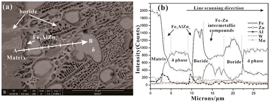 The element distribution of the corrosion layer near the matrix in alloy Fe-3.5B-11W-7Mn-1Al is shown in Figure 7. It can be seen that the Fe-3.5B-11W element is indeed enriched at the interface between the matrix and the corrosion diffusion layer. Mn atoms mainly enter into the borides because of the similar atomic radius (RMn = 0.132 nm, RFe = 0.127 nm) and electro-negativities (, ) of Mn as a replacement for Fe in borides. It is related to the smaller W diffusion coefficient and smaller solubility in the molten zinc pool. It can be seen from the distribution of Zn in the boride phase that the solubility of Zn is very low, which is the reason why the boride resists molten zinc corrosion. Due to the greater diffusion coefficient of zinc (DZn > DFe) in the zinc bath, zinc atoms easily diffuse to the corrosion interface along the grain boundaries of Fe-Zn compounds. Subsequently, a few zinc atoms enter the (Fe, W, Mn)2B lattice. The fracture toughness of (Fe, W, Mn)2B is higher than (Fe, W)2B, which delays the formation of the crack. Moreover, Al diffuses in preference to Fe atoms, and dissolves at the interface between α-Fe and the borides, leading to the formation of Fe3AlZnx.