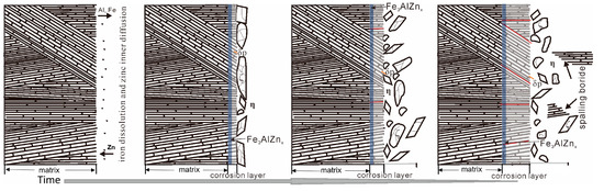 - Ma, S.; Xing, J.; He, Y.; Fu, H.; Li, Y.; Liu, G. Effect of orientation and lamellar spacing of Fe2B on interfaces and corrosion behavior of Fe-B alloy in hot-dip galvanization. Acta Mater. 2016, 115, 392–402. [Google Scholar] [CrossRef] [Green Version]