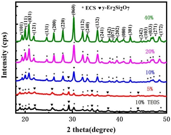 It is noteworthy that the reference sample and samples with a lower Er3+ concentration show some new diffraction peaks in addition to ECS crystals, which were marked with diamonds shown in Figure 1. These peaks are supposed to arise from erbium oxide or silicate, but there is no known Er-related phase in the JCPDS reference database fully corresponding to the XRD pattern. Other RE3+-related phases, especially those with a close ionic radius to Er3+, may be retrieved for reference as the crystal structures of rare earth oxide and silicate are dependent on ionic radius. This method was proved to be appropriate in previous studies [29,30]. According to the fact that the ionic radii of Er3+ and Y3+ are nearly the same, it is reasonable to attribute these new diffraction peaks to y-Er2Si2O7 in the context of the large similarity between y-Y2Si2O7 (JCPDS No. 74-1994) and observed peaks [29]. The appearance of y-Er2Si2O7 phases in samples with lower Er3+ concentration is likely to be related to the local Er:Si molar ratio. When the Er3+ concentration is too low, local Er:Si molar ratio is not large enough for the formation of pure ECS with a 3:2 Er:Si ratio, as reported in Er-doped silica film deposited by magnetron sputtering [31]. Therefore, the reference sample and samples with a lower Er3+ concentration are composed of a mixture of ECS and y-Er2Si2O7, and the reference sample contains more y-Er2Si2O7 than ECS due to a fairly strong diffraction peak of y-Er2Si2O7.