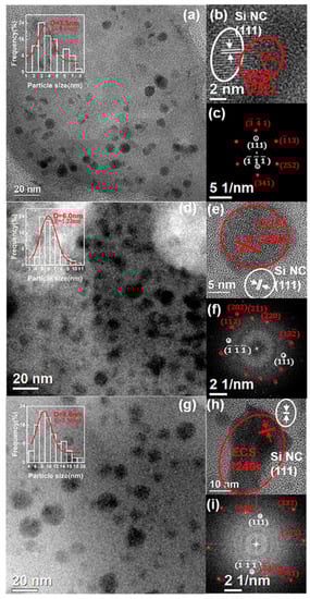 The HRTEM images as shown in Figure 2b,e,h demonstrate that there is another type of nanocrystal near to some dark nanoparticles and confirm their crystalline nature with high crystallinity. The measured interplanar spacings of dark nanoparticles are 1.92, 3.18 and 2.70 Å, consistent with the (252), (220) and (240) crystalline planes of orthorhombic structure of ECS, respectively. On the other hand, all the lighter nanocrystals present a lattice spacing of about 3.1 Å that is well matched with the (111) interplane distance of the diamond structure of Si. Although the measured interplane spacings of these nanocrystals are in good agreement with the designated crystalline planes, the confirmation of the phase structure would require a more in-depth analysis owing to the close interplane spacing within different Er-related phases and silicon. FFT patterns of corresponding HRTEM images further demonstrate that these two types of nanoparticles are attributed to be ECS and Si NC, and the determined Miller indices of crystalline planes were marked in Figure 2c,f,i.