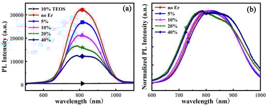 (a) The visible range PL spectra of reference sample and samples with different Er:Si ratio (0–40%), (b) normalized PL spectra of (a) excluding reference sample.