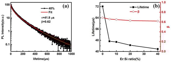 (a) PL decay curve of Si NC-related luminescence at 800 nm of sample with 10% Er:Si ratio and corresponding fit curve by stretched exponential function, (b) lifetimes and distribution factors (β) extracted from stretched exponential function of samples with different Er:Si ratio.