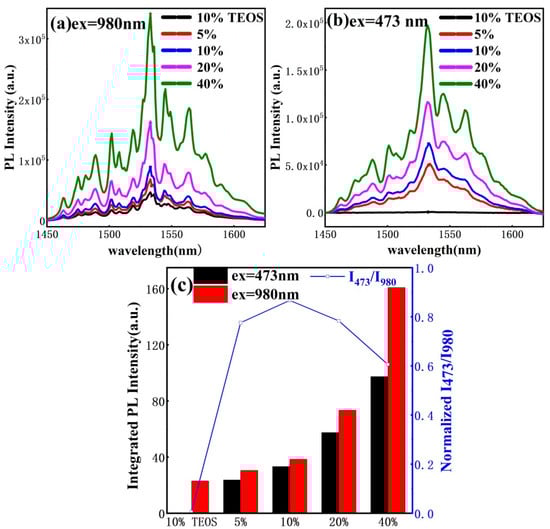 Near-infrared range PL spectra of reference sample and samples with different Er:Si ratio excited by (a) 980 nm laser and (b) 473 nm laser; (c) Integrated PL intensity and the ratio of integrated intensity excited by 473 nm to that by 980 nm laser (I473/I980).