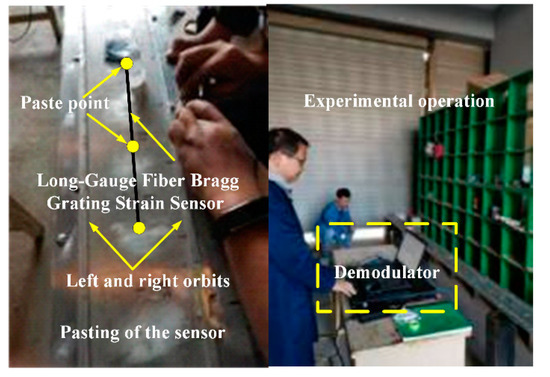 - Influence of track irregularity: because of the lack of advanced processing technology, an irregularity exists in the upper roof track of the bridge. Consequently, wheel–rail collision can occur during the movement of the vehicle, producing an effect similar to percussion excitation and affecting the accuracy of strain data collection.