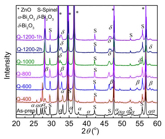 XRD patterns of the samples are presented in Figure 1, which clearly demonstrates that ZnO phase (JCPDS card no. 79-0206) is the main phase. In addition, some impurities of Bi-rich phases and spinel phases (JCPDS card no. 82-1101) are detectable, as well. In accordance with other previous reports [16,22], the Bi-rich phases are different in samples quenched at different temperatures. In the samples with elevated quenching temperatures, i.e., samples Q-1200-2h and Q-1000, the Bi-rich phase is mainly observed as δ−Bi2O3 cubic phase (JCPDS card no. 42-0185). In the samples Q-800 and Q-600, it is found to be β−Bi2O3 tetragonal phase (JCPDS card no. 74-1374). When the quenching temperature is further lowered below 600 °C, α−Bi2O3 phase (JCPDS card no. 71-2274) is observed in both Q-400 and as-prepared samples.