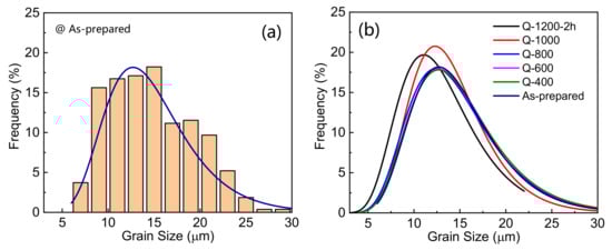 Grain size distributions of all the samples are further plotted in Figure 3b and the corresponding parameters are listed in Table 1. With a decrease in quenching temperature, the curves in Figure 3b slightly move towards larger grain size. As a result, the average grain size E(X) gradually increases from 13.23 µm for sample Q-1200-2h to 14.81 µm for the as-prepared sample. Meanwhile, the coefficient of nonuniformity ε decreases firstly, rises, and finally reaches to a constant. It indicates that grains trend to be more uniform in the temperature range from 1200 to 1000 °C, in which small grains disappear. Subsequently, slight increases in the sizes of those large grains leads to a slight increase in the coefficient of nonuniformity ε in the temperature range from 1000 to 800 °C. The fitting curves in Figure 3b are almost coincided with each other, when the quenching temperature is blow 800 °C. It indicates the grains of the ZnO varistor ceramics would grow little as long as the temperature was below 800 °C.