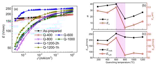The J-E curves of ZnO ceramic samples quenched at different temperatures (a). Dependence of nonlinear coefficient α and activation energy of conductivity Eσλ (b) and electric fields at 1 mA/cm2 and 1 μA/cm2, i.e., E1mA and E1μA, (c) on the quenching temperature.