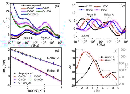 Electron trapping of point defects of DSBs could be presented as dielectric relaxations, so that ε″ spectra of samples are plotted in Figure 5a. The ε″ is the imaginary part of complex permittivity and dielectric relaxation could be presented as loss peaks in the frequency-domain ε″ spectroscopy [24]. There are two relaxations A and B at −100 °C, which correspond to intrinsic point defects in depletion layers of DSBs [24,34]. The dependences of those relaxation processes on temperature, taking the Q-600 samples as an example, is further demonstrated in Figure 5b. Both of them are found to shift towards a higher frequency range with the increase in temperature. The peak frequencies as a function of the measuring temperature fit well with the Arrhenius equation, which is presented in Figure 5c. The corresponding activation energies of relaxations A and B are listed in Table 3, which are constant to 0.23 and 0.33 eV, respectively. They are equal to the trap depth of intrinsic point defects Zni¨ and VO˙, respectively [24]. In consequence, the evolution of them could be possibly characterized via fitting the ε″ spectra by using the Cole–Cole equation [23,24,35,36]: