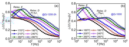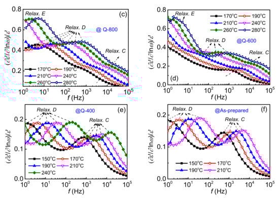 Dielectric spectra (∂ε′/∂lnω)/ε′ at elevated temperatures of Q-1200-2h (a), Q-1000 (b), Q-800 (c), Q-600 (d), Q-400 (e) and as-prepared samples (f).