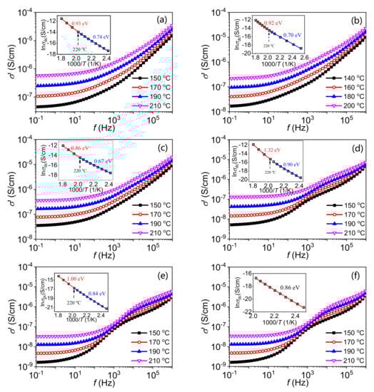 Figure 6 shows (∂ε′/∂lnω)/ε′ spectra at elevated temperatures of the samples, in which three loss peaks (labeled as C, D and E with the increase in relaxation time) are observed. All the peaks follow the Arrhenius relation so that their relaxation activation energies can be calculated, which are listed in Table 3. Relaxations C and D were reported previously [24], while relaxation E is firstly found in this work.