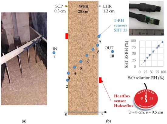 The test wall corresponds to a quarter of the separation wall of these rooms (Figure 1b). It is 110 cm long and 100 cm high. It consists of a 28 cm thick layer of washing fine-hemp composite (WFH), coated with a 0.3 cm thick skincoat clay plaster (SCP) on the indoor side and with a 1.2 cm thick lime-hemp render (LHR) on the outdoor side. The washing fine-hemp composite is made of a clay-based matrix with hemp shiv. The clay-based matrix is made of fines from aggregate washing mud taken from a gravels production site. The fine is stabilized with 5% of Portland cement CEM: 52.5 N CE CP2 NF from Lafarge (Paris, France) and 5% of lime-based binder (Thermo from BCB). The bio-based aggregates are CAVAC Biofibat hemp shiv (La Roche-sur-Yon, France). The hemp to binder mass ratio is 0.5 and the total water to binder mass ratio is 0.8. For the production, the hemp shiv is mixed with a part of the water by hand for about 2 min (with water to hemp mass ratio of 0.4). At the same time as washing the fine, stabilizers and water are mixed with a vertical axis concrete mixer to form the matrix paste. The mix is then poured in place and manually compacted. The mold is released after one week and the drying of the WFH is obtained after 2 months. The indoor plaster SCP is a skincoat clay plaster from CLAYTEC® (Viersen, Germany), (referred as Lehm-Oberputz fein 06). The outdoor render LHR is a two layers lime-hemp render made of BSP® formulated binder developed by Lhoist within the European ISOBIO project [27] and Isofin® hemp. The physical properties of these composites are detailed in Section 2.4.