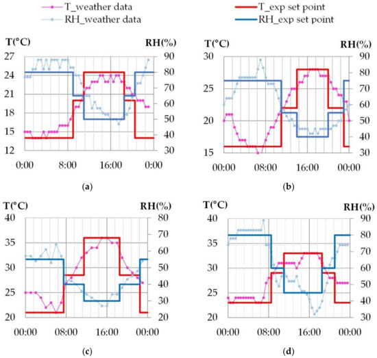 For each climate, a typical day is chosen to be representative of the minimum and maximum 30-year average temperatures in August (France: 1981–2010 [28], Tunisia: 1961–1990 [29]) [30]. The study is performed without considering solar gains nor rain and is thus representative of north walls, cloudy days and of walls with sunscreen effect. This allows to investigate the effect of ambient temperature and relative humidity on the hygrothermal behavior of the wall. Due to the experimental device regulation, the climate cycles are simplified as shown on Figure 3, with four temperature and relative humidity steps.