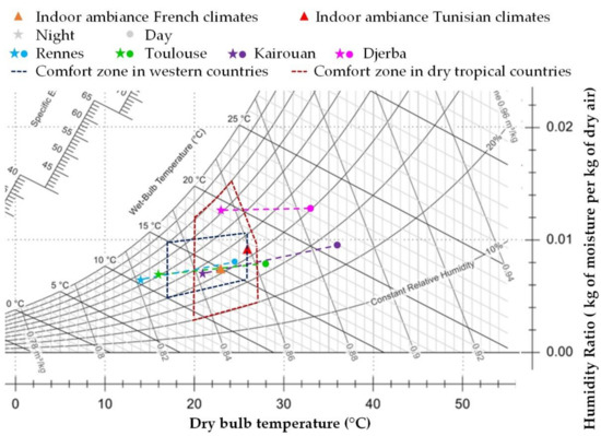 The indoor conditions are chosen in the comfort zone to be representative of the indoor environment considered for each country in summer [31,32]: (23 °C, 50% RH) for French climates and (26 °C, 50% RH) for Tunisian climates (Figure 4).