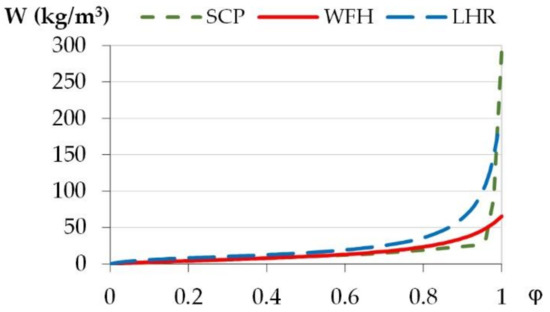 Table 3 gives the physical properties of the materials. They are taken from Collet et al. [34] for the lime-hemp render (LHR), from Mazhoud [26,35] for washing fines hemp (WFH) and from WUFI Pro 6.5 database for the Skincoat Clay Plaster (SCP). For WFH and LHR, the experimental sorption curves are fitted, using least square method, with GAB model (1) [36,37,38,39]. Then, the mass water content is calculated from the GAB model each at 1% RH and the volume water content is deduced from the mass water content and from water and material densities. The sorption curves are input into Wufi material database [40] (Figure 7).