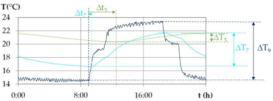 Example of identification of the temperature shift phase Δt between the surface (9) and given points (5 and 7) and of the temperature amplitude at the surface and at given points.