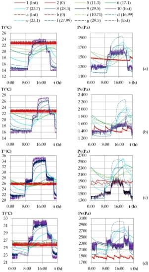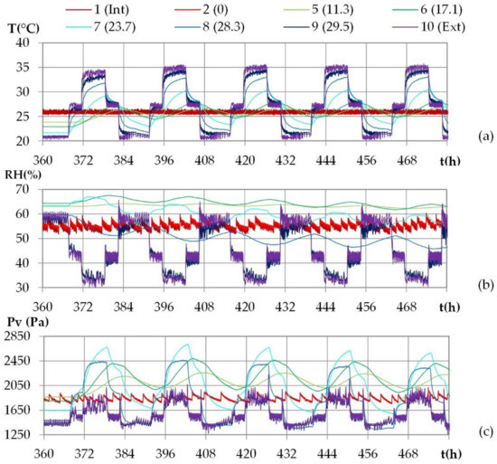 The hygrothermal behavior of the wall is analyzed from the temperature, the relative humidity and the vapor pressure evolutions. The vapor pressure Pv (Pa) is calculated from experimental data of temperature T (°C) and relative humidity (−) as follows [40]: