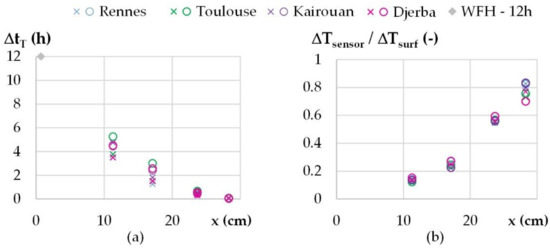 For temperature, regarding the experimental results, the temperature beams show low amplitude over the first third of the wall thickness on the interior side. For the French cities, the temperature gradient is negative from the indoor to the outdoor side of the wall. There are no heat gains through the interior surface of the wall when the solar gains are not considered. For the Tunisian cities, the temperature gradient on the first third of the thickness of the wall are slight and reverse during the day, with a negative gradient from the indoor side to the outdoor side during the day, and the reverse at night. This induces slight gains at night and losses during the day through the interior surface of the wall. On the exterior side of the wall, the temperature decrease at night is more pronounced for French cities due to chilly nights, the temperature increase during the day is higher for the Tunisian cities as the climate is hotter. The temperature gradients on the exterior surface of the wall evolve noticeably in amplitude and direction during the day, following the outdoor ambience solicitation. The heat transfer on the exterior side leads to a storage/release with a rapid increase/decrease in the temperature in the exterior layers and then delayed over the thickness of the wall. Finally, the two thirds of the wall thickness on the exterior side are active, and contribute to limiting, or even avoiding, heat gains on the interior side. Regarding the numerical results, the profiles are highly consistent with the experimental ones. As the solicitation signals are smoothed for input to the numerical simulation, the numerical amplitude of the temperature beam is slightly lower than the experimental one on the interior side of the wall. On the two thirds of the wall thickness on the exterior side, the numerical temperature beam meets the experimental one.