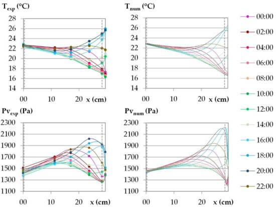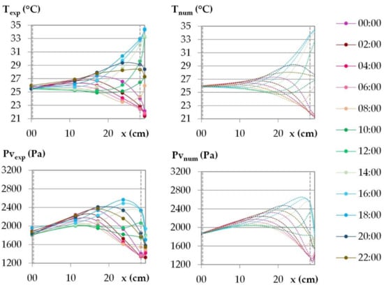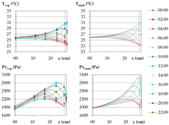 Figure 9 and Figure 10 give the temperature and vapor pressure profiles over the wall. They correspond to average values over the last 24 h of the phase under constant temperature and vapor pressure gradients. The theoretical profiles are linear as they are calculated, under constant temperature gradients, from heat flux and thermal resistances.