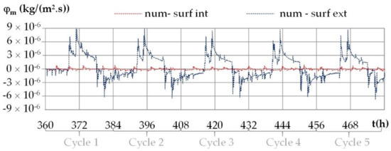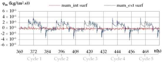 The moisture flux is positive when moisture flows from the indoor side to the outdoor side. Like previously, the moisture flux repeats during the cycles. The moisture flux exhibits higher fluctuations than the heat fluxes as the ambient vapor pressure fluctuate more than the ambient temperature. On the interior surface, the moisture flux is close to zero (see in the Figure 21). On the exterior surface, the moisture flux shows a peak at the set point change, with intensity up to 3 × 10−6 kg/(m2·s) for Kairouan, 4 × 10−6 kg/(m2·s) for Rennes, 5 × 10−6 kg/(m2·s) for Toulouse and 7 × 10−6 kg/(m2·s) for Djerba. For Djerba, like for the three other cities, the moisture flux reverses during a daily cycle even if the ambient vapor pressure gradient remains from the outdoor side to the indoor side. The incoming/outgoing moisture fluxes are thus not only due to the ambient vapor pressure gradient but also to sorption–desorption effects enhanced by the temperature variation over the wall.